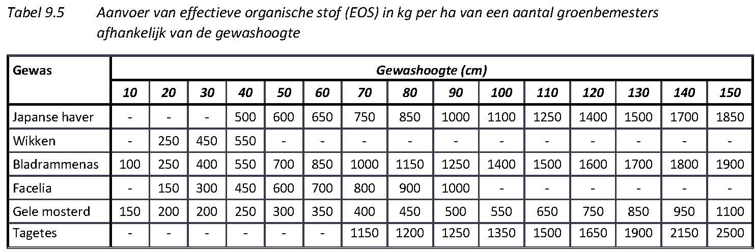 De EOS-aanvoer door groenbemesters hangt af van de mate van gewasontwikkeling. In tabel 9.4 is voor tien groenbemestersoorten een gemiddelde relatie weergegeven tussen EOS-aanvoer en zaaimoment dan wel oogstmoment van het hoofdgewas in geval van onderteelt van de groenbemester. Van andere groenbemestersoorten is hierover (nog) geen of onvoldoende informatie beschikbaar. Bij zes van de tien soorten is er ook een relatie tussen gewashoogte en EOS-aanvoer. Dit is in tabel 9.5 weergegeven.