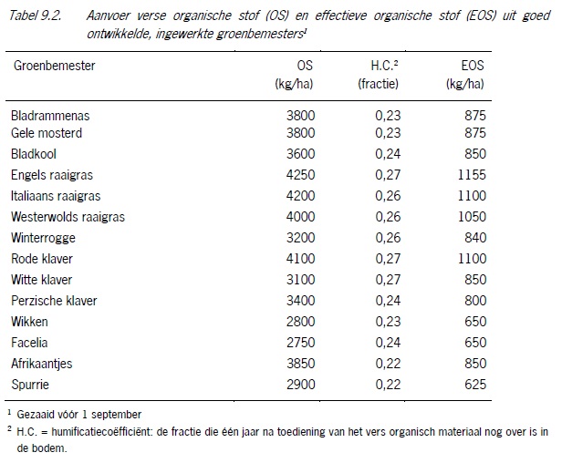 In de tabellen 9.1 t/m 9.3 zijn kengetallen weergegeven voor de aanvoer van EOS. Deze getallen worden gebruikt voor het opstellen van de organische-stofbalans. De kengetallen betreffen gemiddelde cijfers per gewas, die kunnen variƫren afhankelijk van opbrengst en ras.
